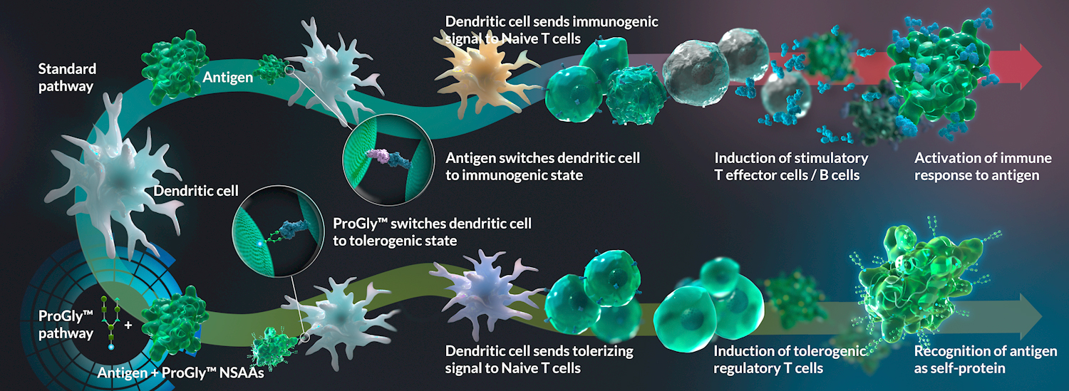 The ProGly platform chemistry comprises glycan-containing NSAAs that can induce or inhibit an immune reaction. The GRO platform enables precise placement of defined ProGly compositions on the protein surface necessary to elicit a defined immune response. The Company’s first ProGly NSAAs reeducate the immune system to treat a protein as “self” or “non-self” — a totally new modality for eliminating autoimmunity and anti-drug antibodies.